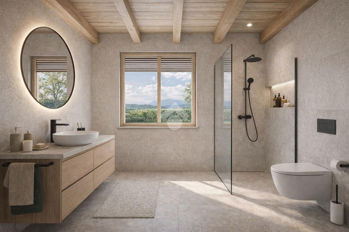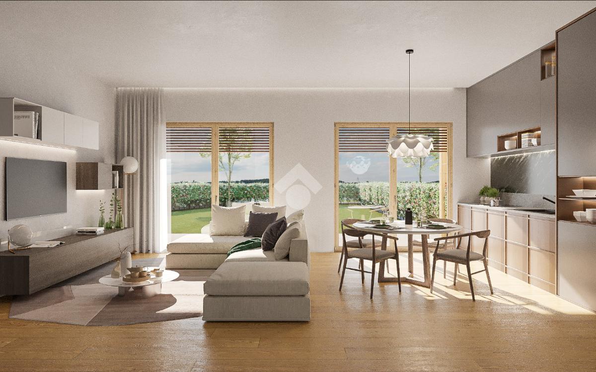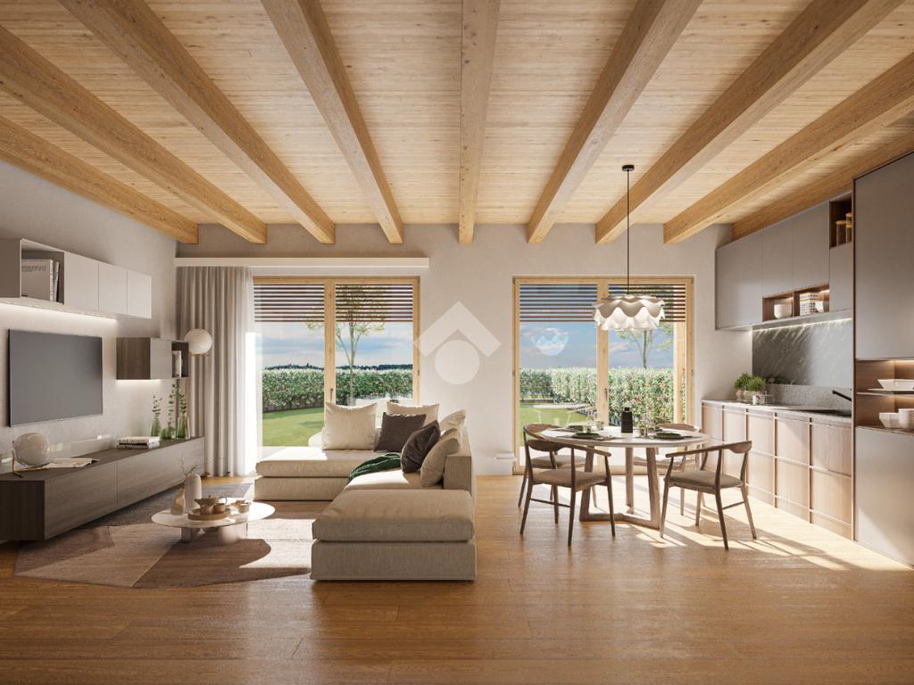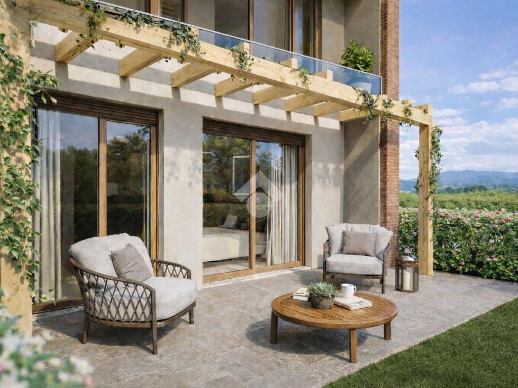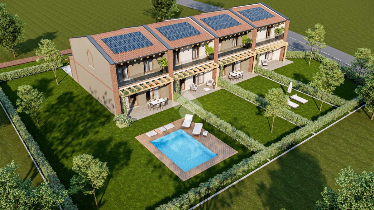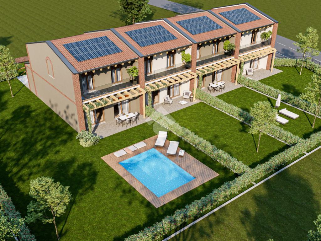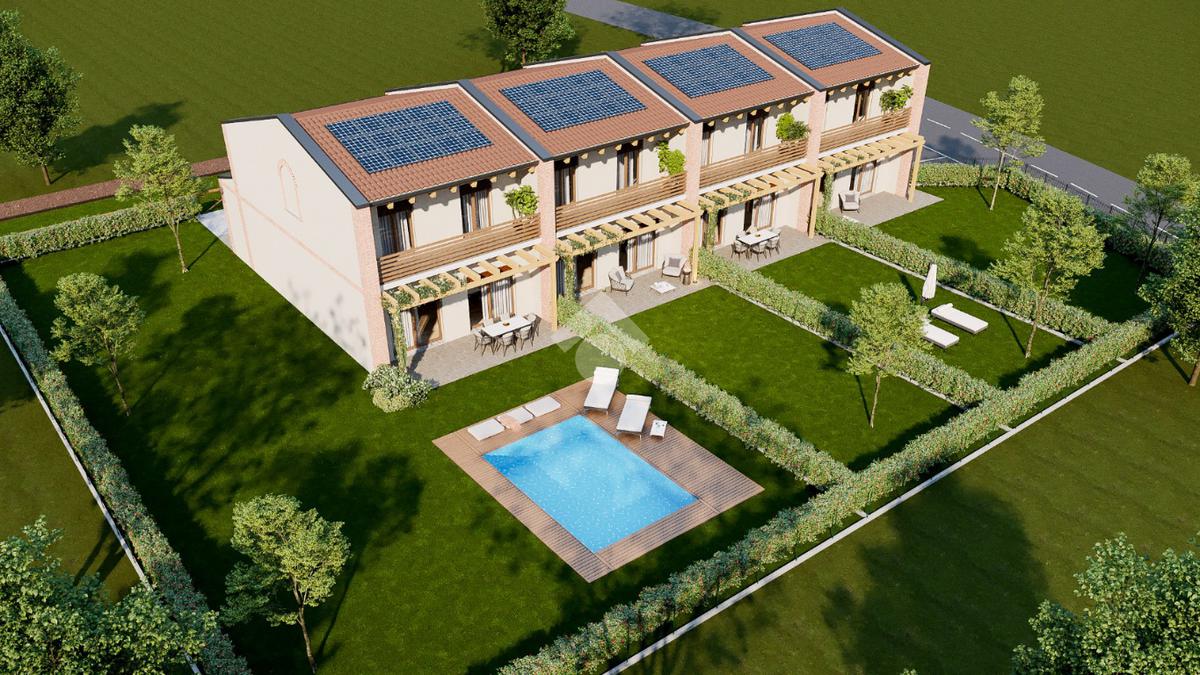 Residenza Green Park Aurora Prenotasi signorili ville a schiera laterali e centrali (Certificazione Energetica “A4”)disposte su due piani fuori terra composte al piano terra da ingresso, ampia zona living di oltre 37 mq con accesso sul portico e sul giardino privato, bagno, ripostiglio e box di mq 22; al piano primo bagno padronale, due camere da letto con balcone di 10 mq e camera matrimoniale con bagno privato al suo interno. CONSEGNA PREVISTA SETTEMBRE 2027. Riscaldamento autonomo a pavimento (diviso per zone) tramite pompa di calore alimentata da impianto fotovoltaico privato di 6 Kw, impianto di climatizzazione canalizzato, tapparelle e basculante box elettriche, solai e tetto in legno a vista, serramenti in Pvc color legno di rovere con triplo vetro fonoassorbente, impianto elettrico frutti Biticino serie Living, termoarredi elettrici nei bagni con sanitari sospesi e capitolato di alta qualità per la scelta di pavimentazioni in grès porcellanato o parquet. Possibilità permuta del vostro immobile usato.